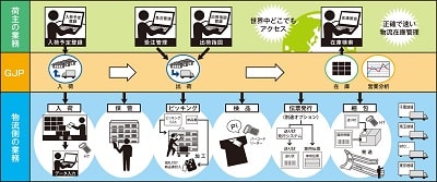 GJP・WMSシステム 【低コスト・短期カスタマイズ開発システム】業務概要…同社WMSシステムはアパレル業界・服飾雑貨業界・バッグ靴業界・スポーツ用品業界・玩具業界等の各種業界やネット通販の物流にも対応した倉庫管理ASPサービスを利用した低コストシステム。ロジスティクス管理として、入荷予定・受注管理・インターネットを通じて全世界より対応可能な出荷指示や在庫検索の他、入出荷在庫情報を元にした営業分析も可能であり、同社では各EOSとの接続や、大手ショッピングサイトとの接続の実績も多い。また、センター側においても入荷・保管・伝票発行・ピッキング・検品・在庫管理等業務運営上の仕組みと共に、ハンディーターミナルを活用した、効率のよい業務運営が可能となっている。